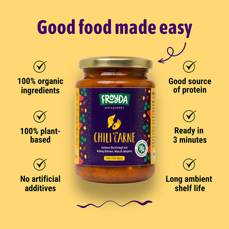 Froyda Chili Sin Carne is ready to eat. To enjoy warm simply heat in a pan for three minutes or two minutes at 500 watts in a microwave.
