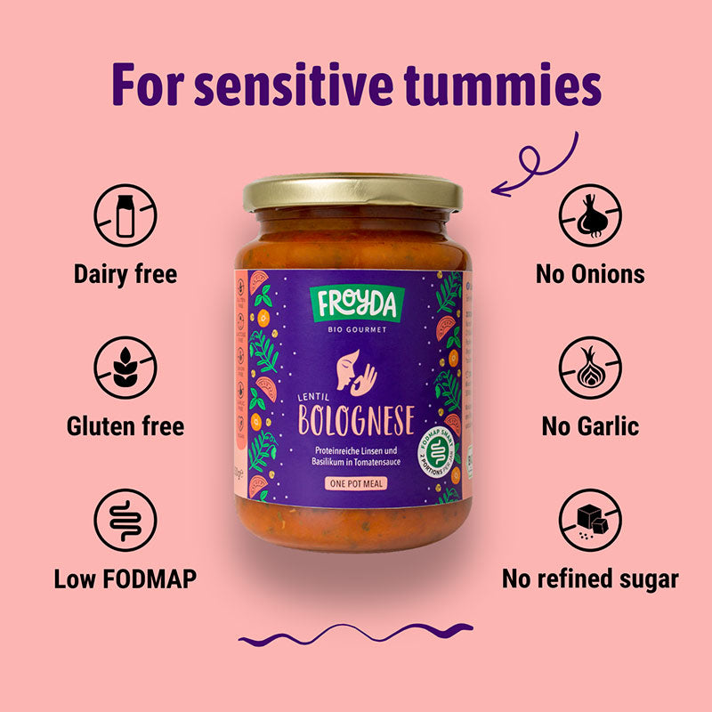 Froyda Lentil Bolognese is certified low FODMAP for a 175 g portion by the Monash University.